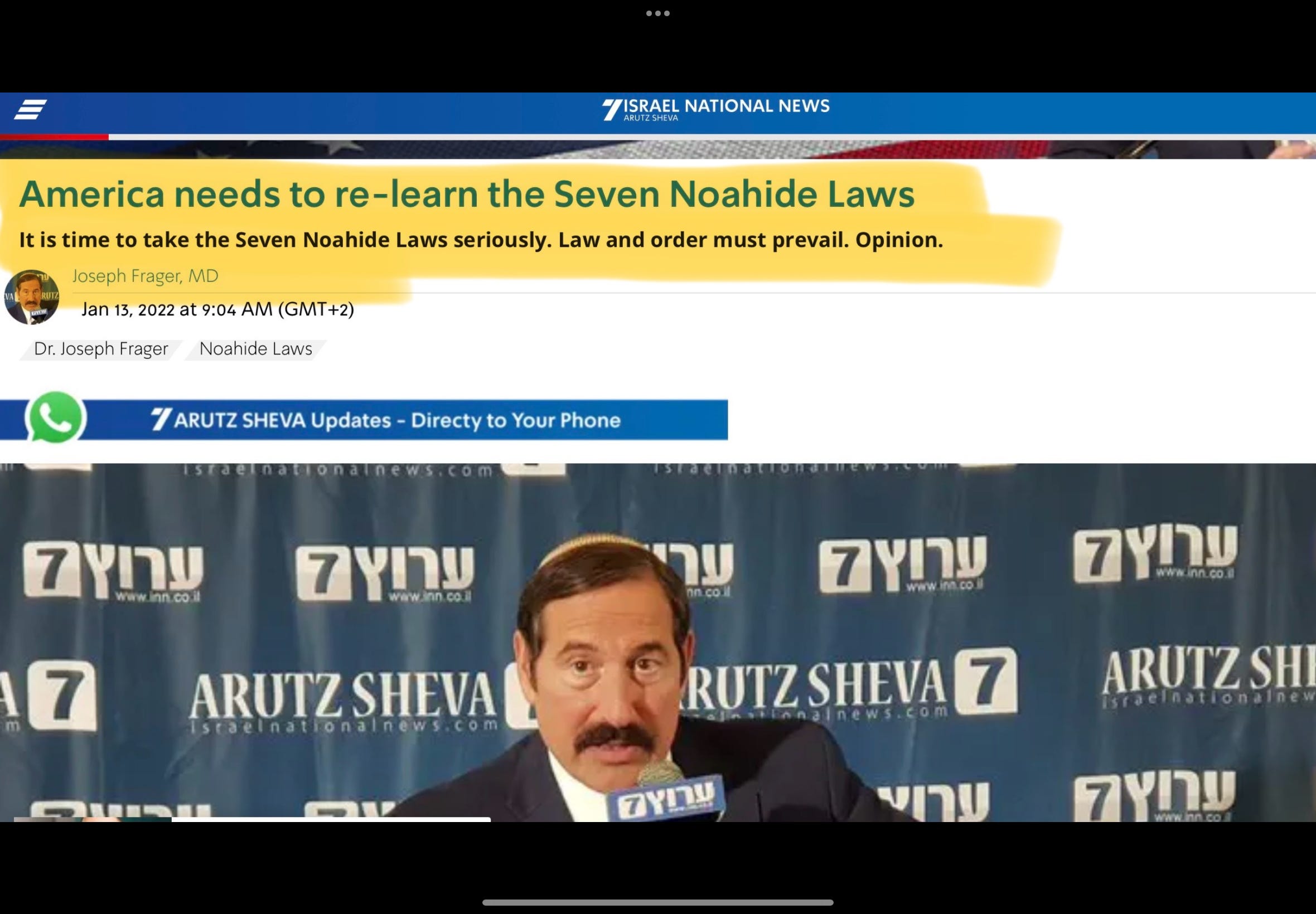 Huckabee’s guide - rabbi Joseph Frager’s call for the Seven Noahide Laws is published in Israel National News (Arutz Sheva). In this piece, Frager argues that the social unrest and polarization in the United States are a direct result of a moral vacuum that can only be filled by returning to Noahide universal code: